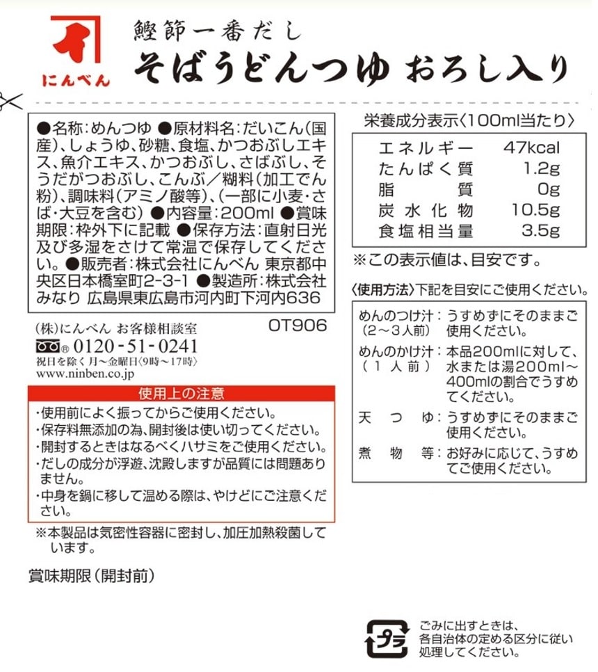 国内製造鰹節、さば節、宗田鰹節と北海道産昆布を使用していて麺に絡みやすく、そば・うどんによく合います。