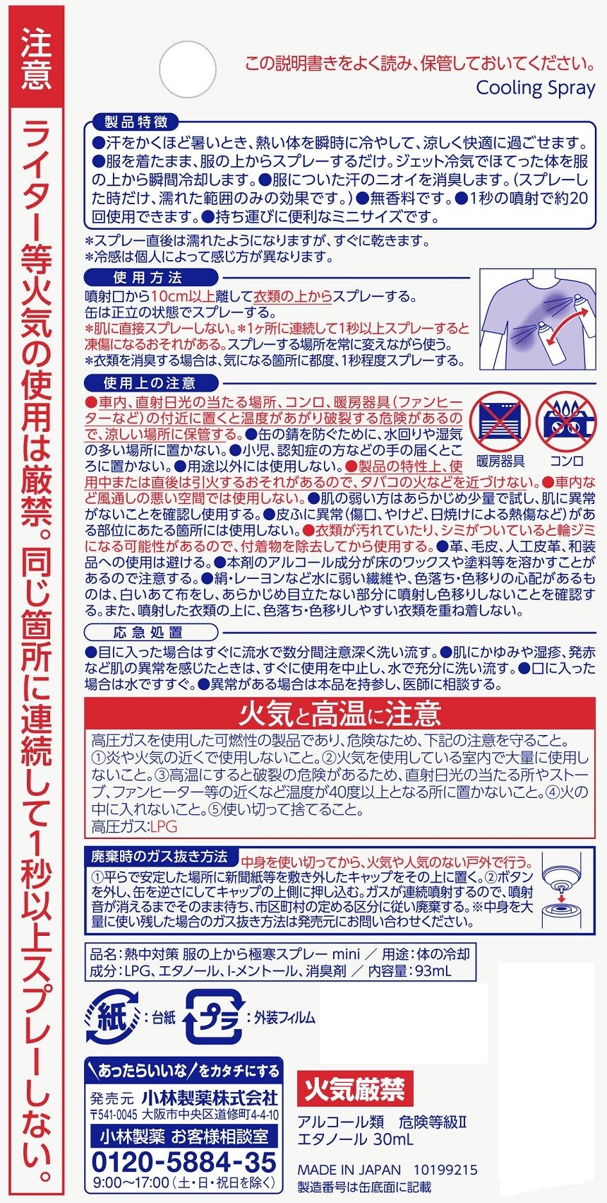 [22個]小林製薬 熱中対策 服の上から極寒スプレー ミニ 無香料 93mL | ジェット冷気で瞬間冷却!