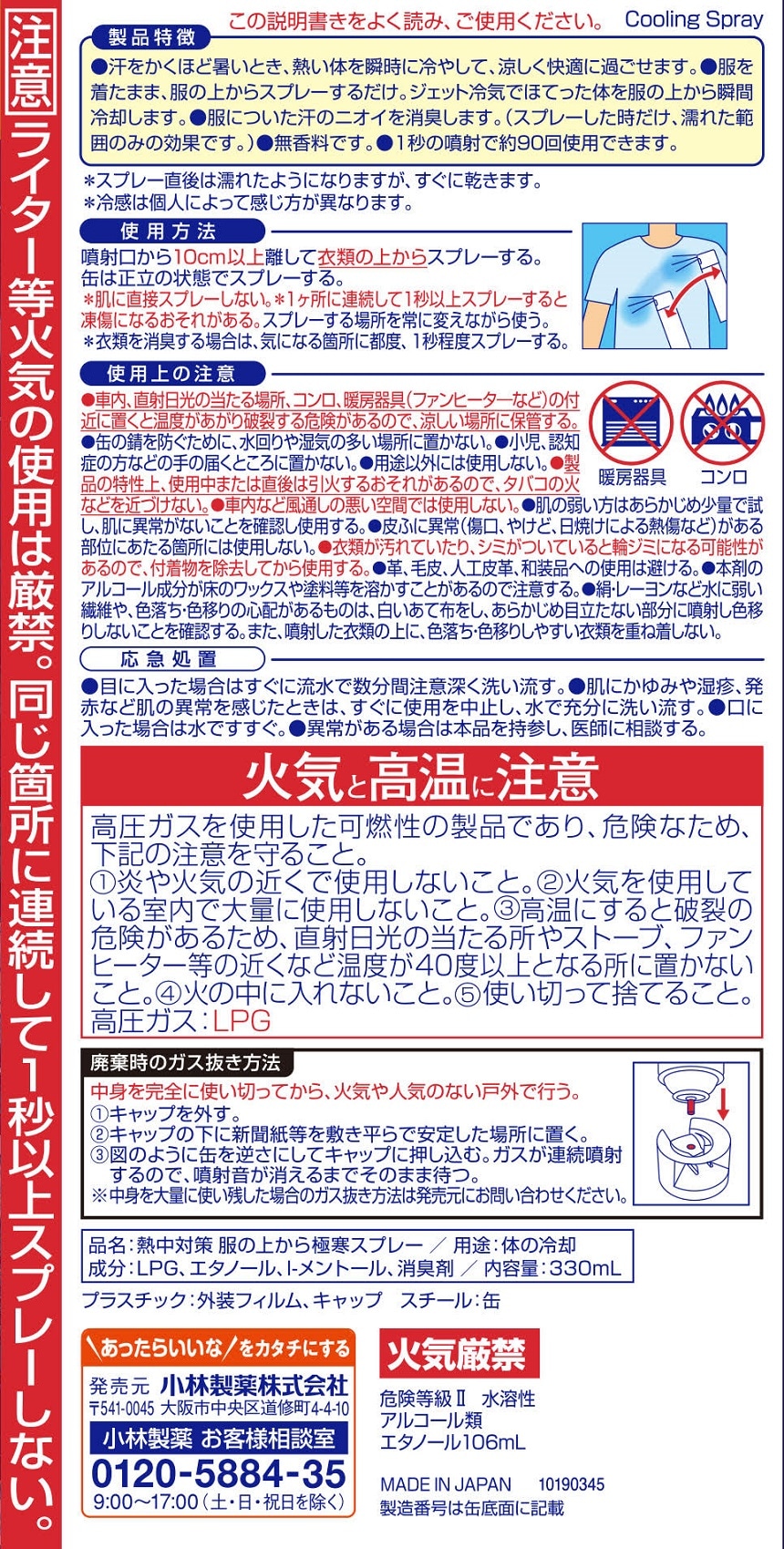 [9個]小林製薬 熱中対策 服の上から極寒スプレー 無香料 330mL | ジェット冷気で瞬間冷却!