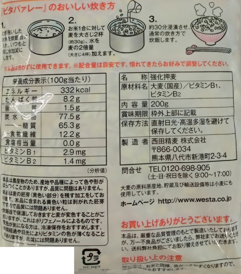 [24袋]西田精麦 胚芽押麦ビタバァレー 200g | 栄養価の高い胚芽押麦にビタミンB1とビタミンB2をプラスしました。