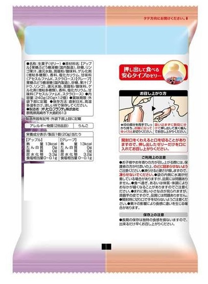 小腹がすいた時の手軽なおやつとしてお召し上がりください。※グレープ味にもリンゴ果汁を使用しております。