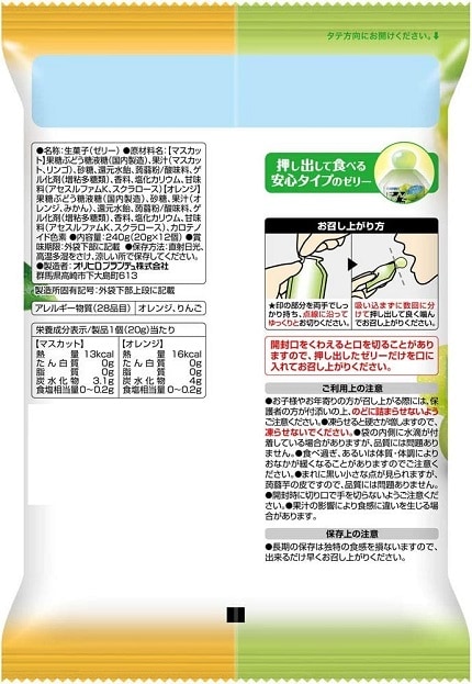 小腹がすいた時の手軽なおやつとしてお召し上がりください。※マスカット味にリンゴ果汁を使用しております。
