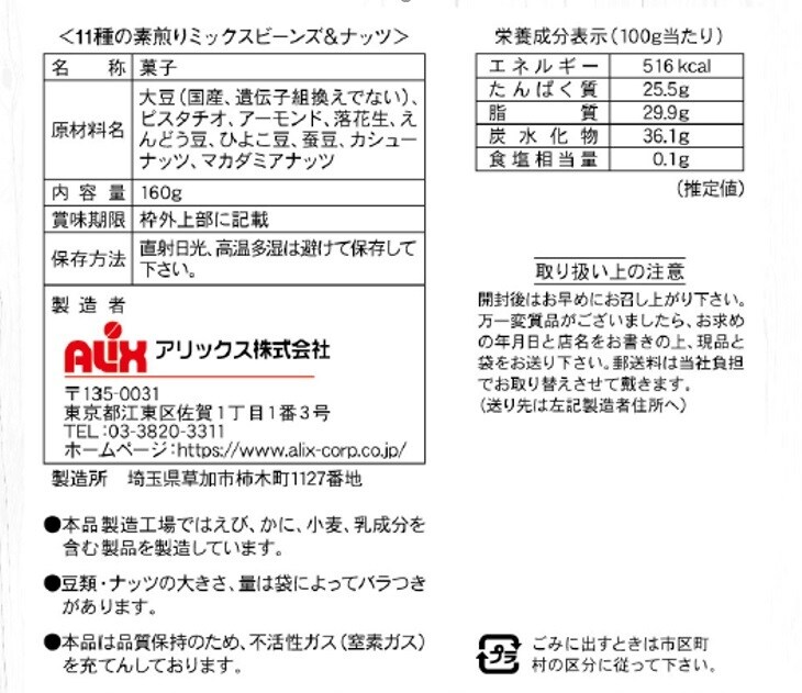 [10袋]アリックス 11種の素煎りミックス ビーンズ&ナッツ 160g | そのまま食べてもヨーグルトやサラダに加えても美味しい、11種の素煎りミックス商品です。