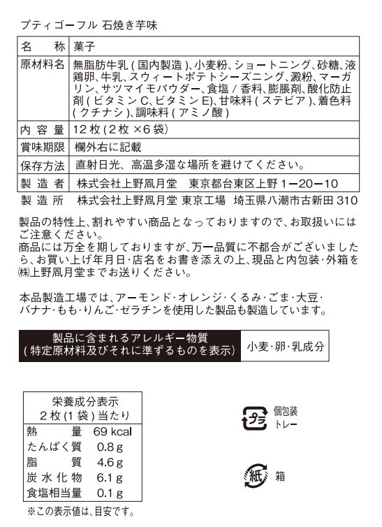 [20箱]上野風月堂 プティゴーフル 石焼き芋味 2枚入り×6袋 | 季節のプティゴーフル 石焼き芋味