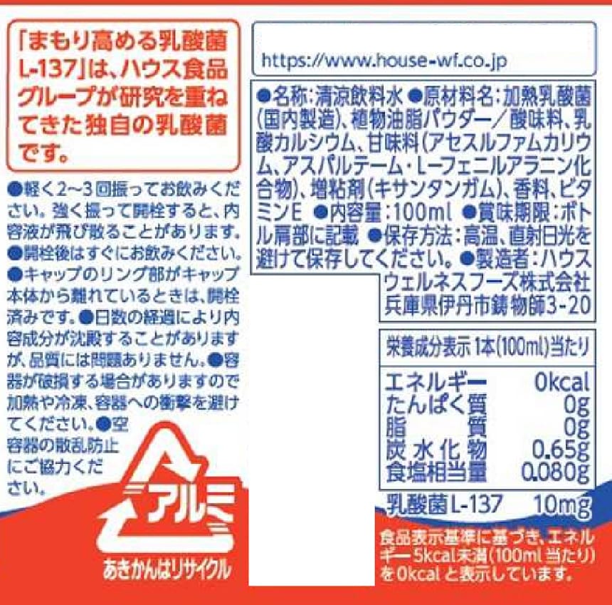 [60本]ハウスウェルネスフーズ まもり高める乳酸菌L-137 ドリンク 100ml | 「乳酸菌L-137」を100億個配合した、乳成分不使用・カロリーゼロのすっきりヨーグルト味のドリンク