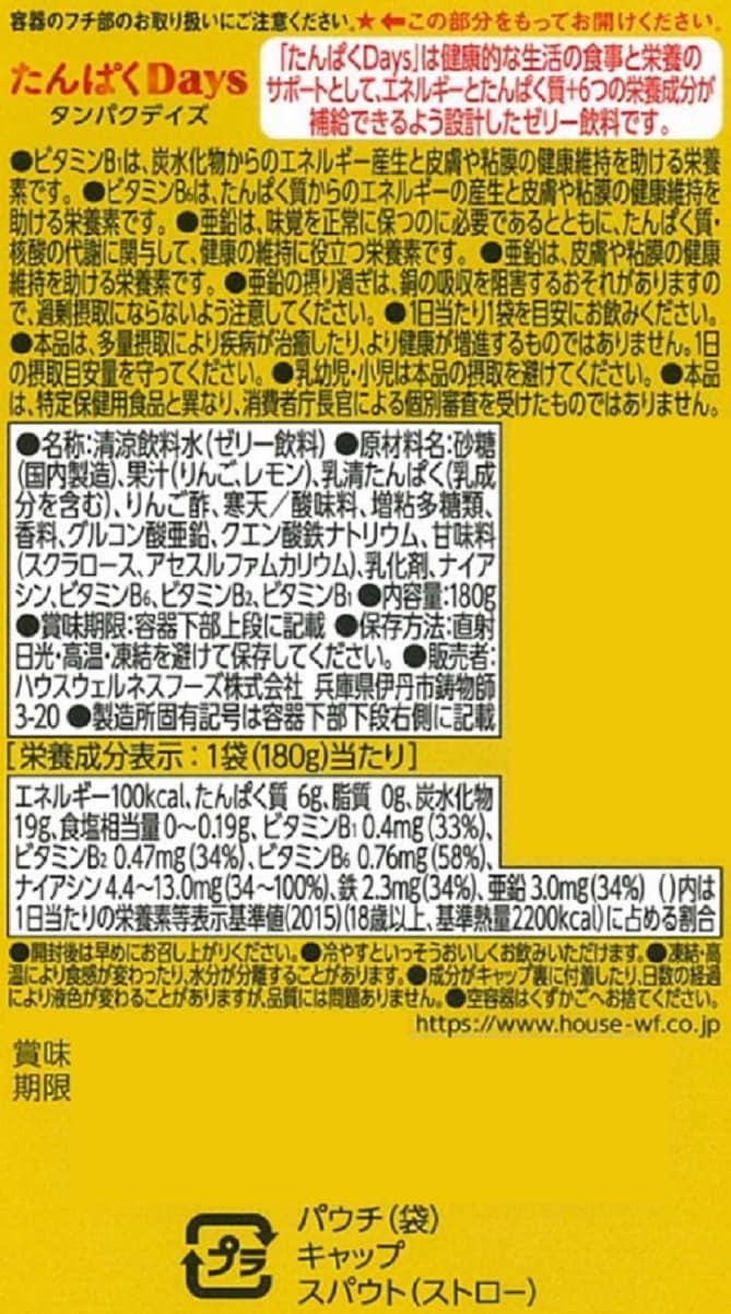 ・たんぱく質6g、4種のビタミン(ビタミンB1、ビタミンB2、ビタミンB6、ナイアシン)、2種のミネラル(亜鉛、鉄)を配合
