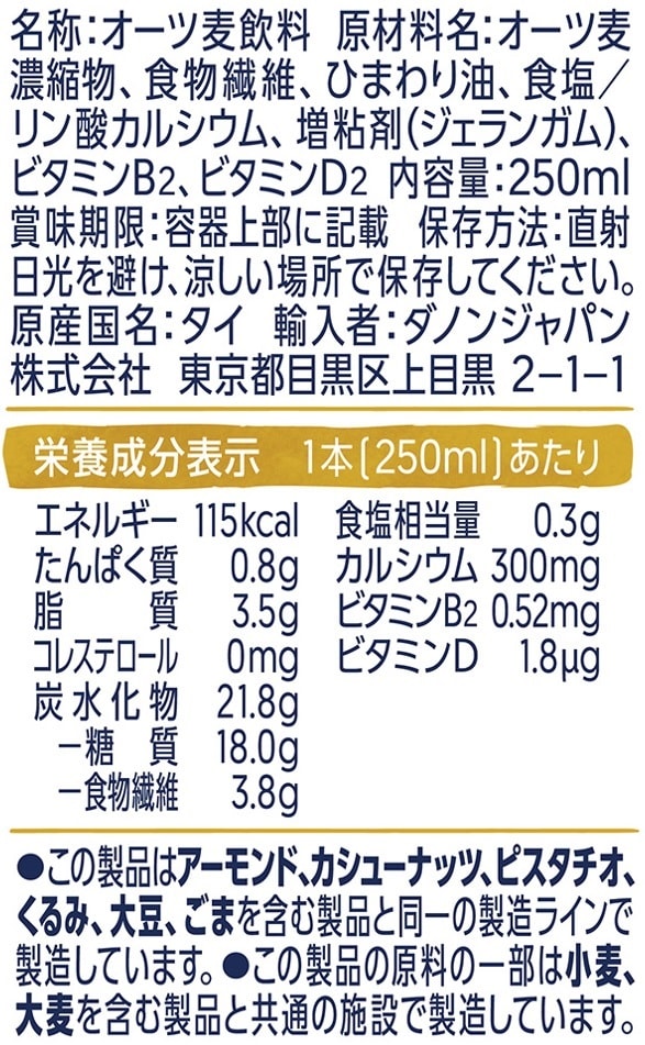 - ダノンジャパン アルプロ オーツミルク オーツ麦の甘さだけ たっぷり食物繊維 250ml