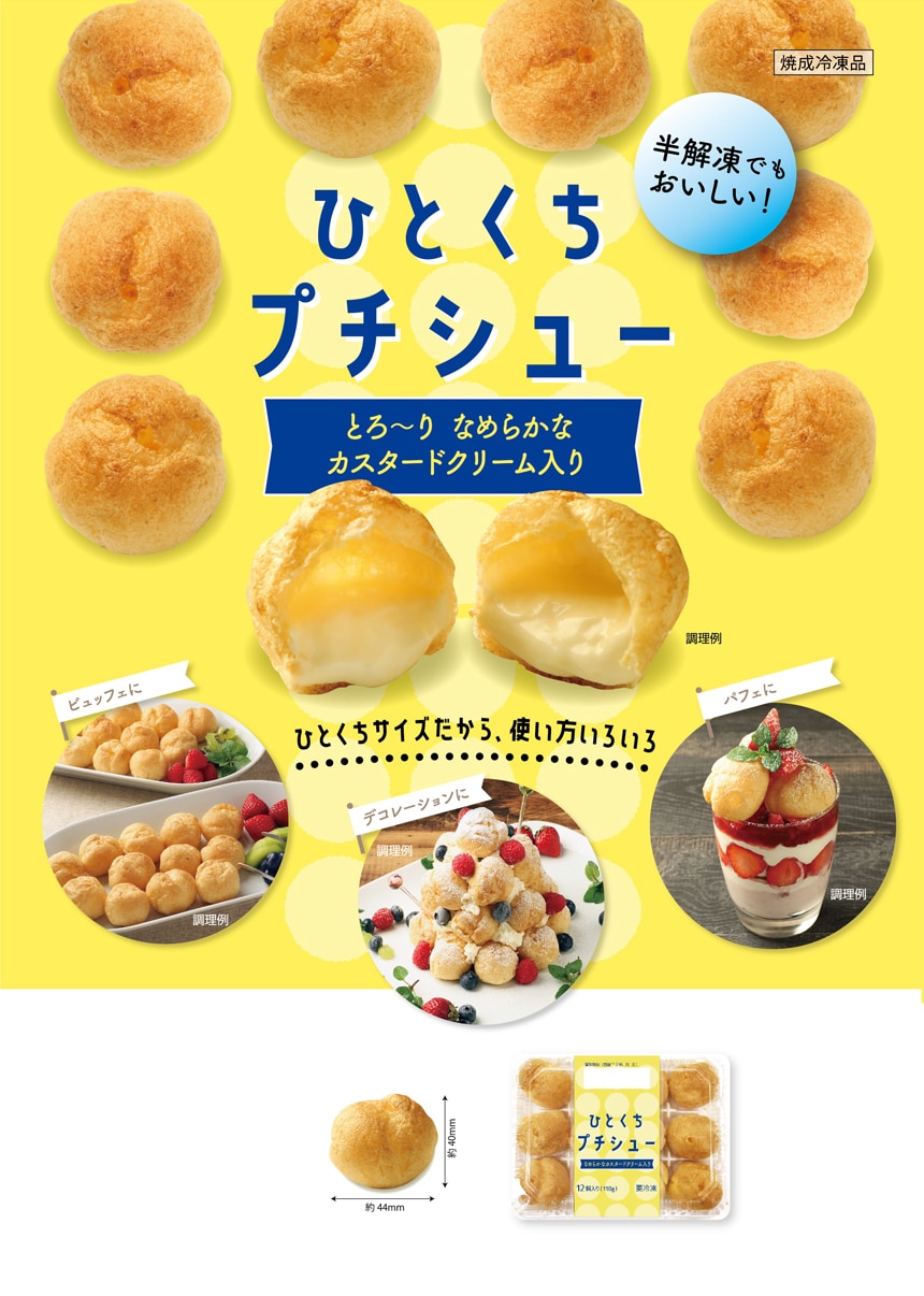 半解凍でも美味しい!とろ~りなめらかなカスタードクリーム入りプチシュー。一口サイズだから使い方いろいろ。