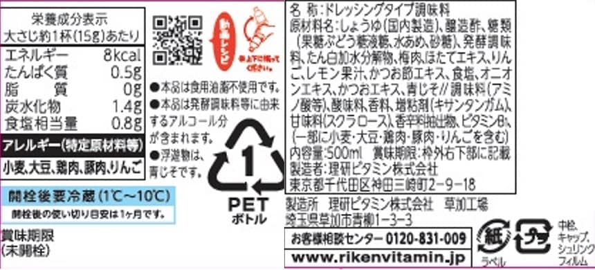 【リケンのノンオイル くせになるうま塩】糖類(果糖ぶどう糖液糖(国内製造)、砂糖)、醸造酢、発酵調味料、食塩、にんにく、ごま、チキンエキス、香辛料、たん白加水分解物//調味料(アミノ酸等)、酸味料、増粘多糖類、酸化防止剤(V.E)