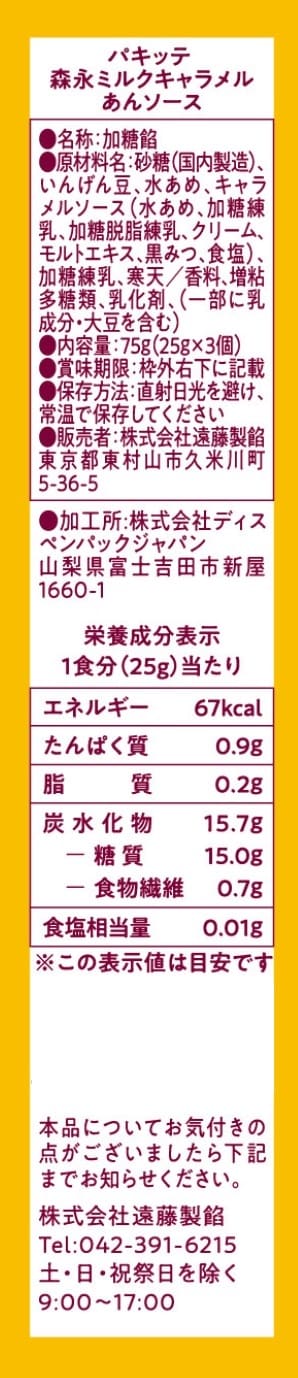[計144個]遠藤製餡 森永パキッテ ミルクキャラメルあんソース 75g(25gx3個)×48袋 | 森永ミルクキャラメルをイメージしたパキッテタイプにキャラメルあんソース