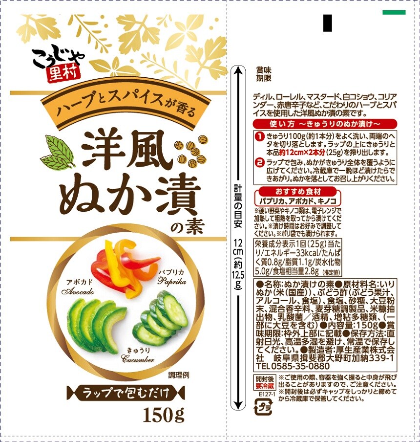 ディル、ローレル、マスタード、白コショウ、コリアンダー、赤唐辛子など、こだわりのハーブとスパイスを使用した洋風ぬか漬の素です。