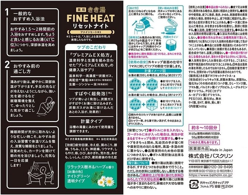 [12個]【医薬部外品】バスクリン きき湯 ファインヒート リセットナイト 400g | 温泉科学と生薬で、現代人の健康増進をサポートする入浴剤