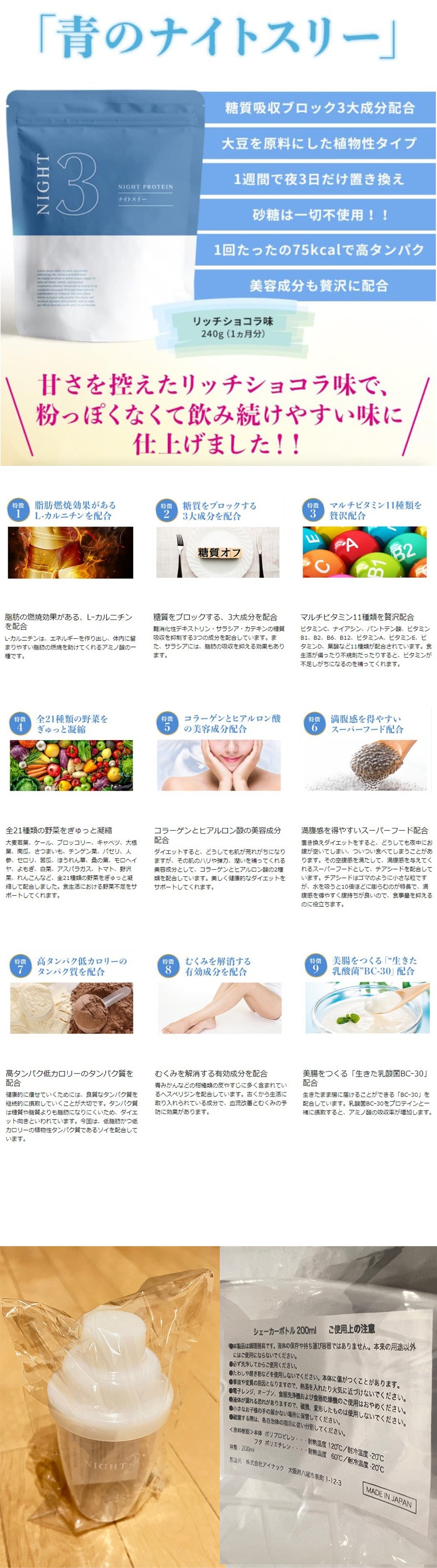 [2種計16個]ナイトスリー プロテイン ダイエット 置き換え ソイプロテイン リッチショコラ味 240g / シェイカー 200ml