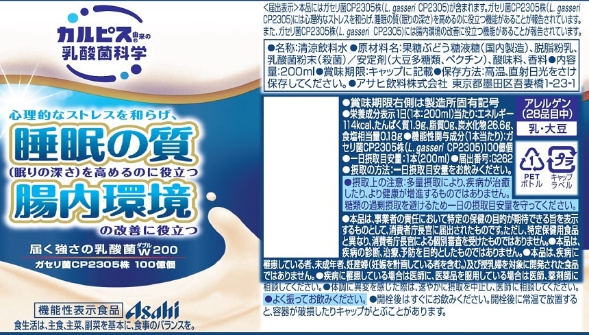 [72本]【機能性表示食品】アサヒ飲料 「届く強さの乳酸菌」W PET 200ml | 「カルピス」に由来する長年の乳酸菌研究により選び抜かれたガセリ菌CP2305株を配合した乳性飲料