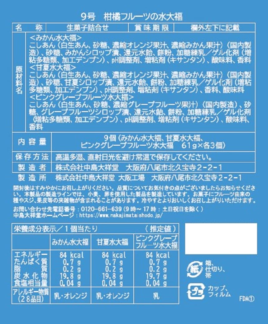 みかん水大福、甘夏水大福、ピンクグレープフルーツ水大福が各3個入ってます。