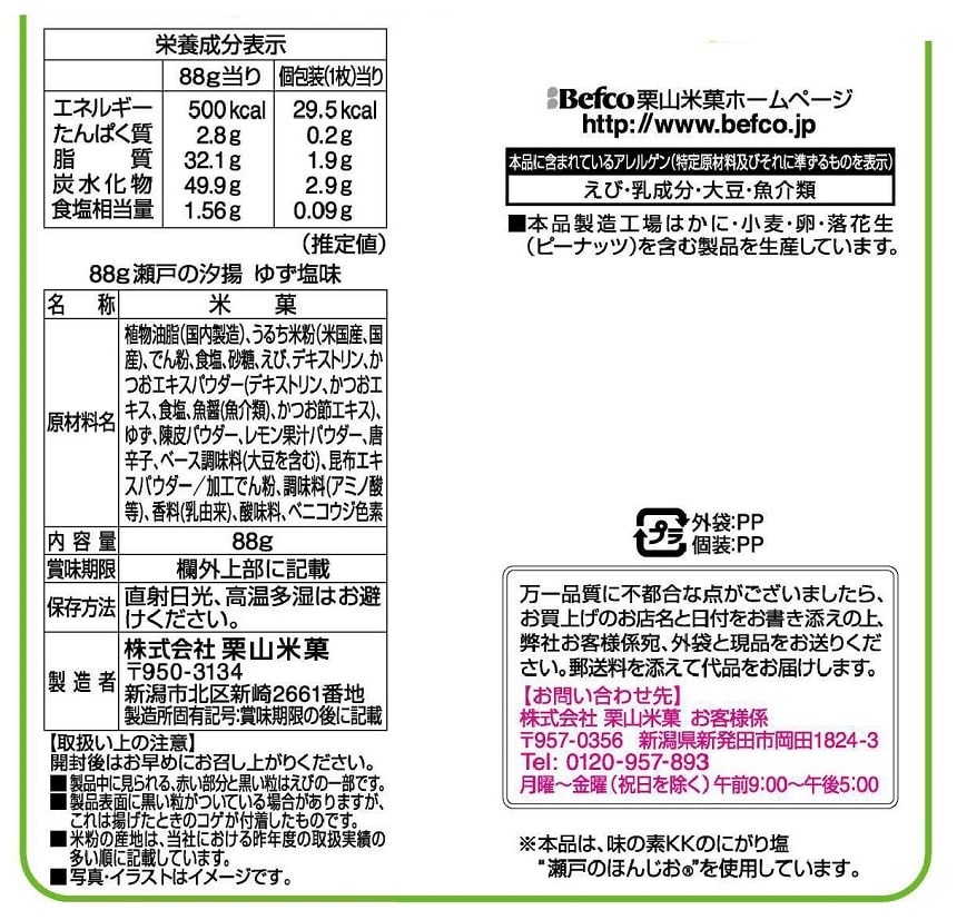 [24袋]栗山米菓 瀬戸の汐揚ゆず塩 88g | サクッとやわらか食感の「瀬戸の汐揚」を爽やかなゆず風味に仕上げました