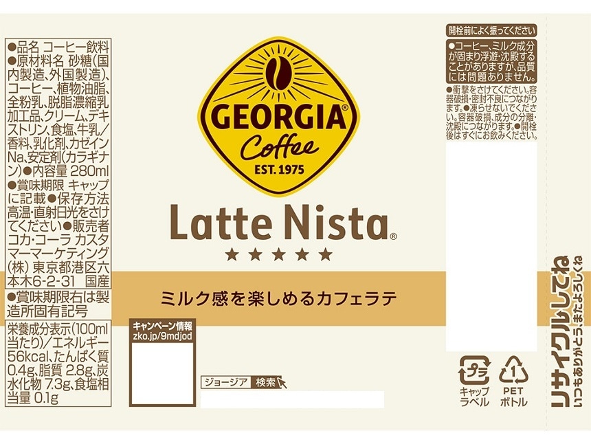 『ジョージア ラテニスタ カフェラテ』は、小型サイズの容器がオフタイムにぴったりな、ミルク感が楽しめるカフェラテです。