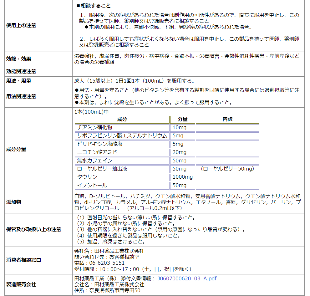 タウリン1000mgにローヤルゼリー抽出液(50mg) 並びにビタミンB1、B2、B6、そしてイノシトール(50mg)を配合した医薬部外品のドリンクです。