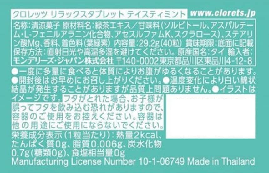 食用油脂,ウラジロガシ茶抽出物,タイム,陳皮,緑茶エキス/甘味料(ソルビトール,アスパルテーム・L-フェニルアラニン化合物,アセスルファムK,スクラロース),ステアリン酸Mg,香料,ペルオキシダーゼ