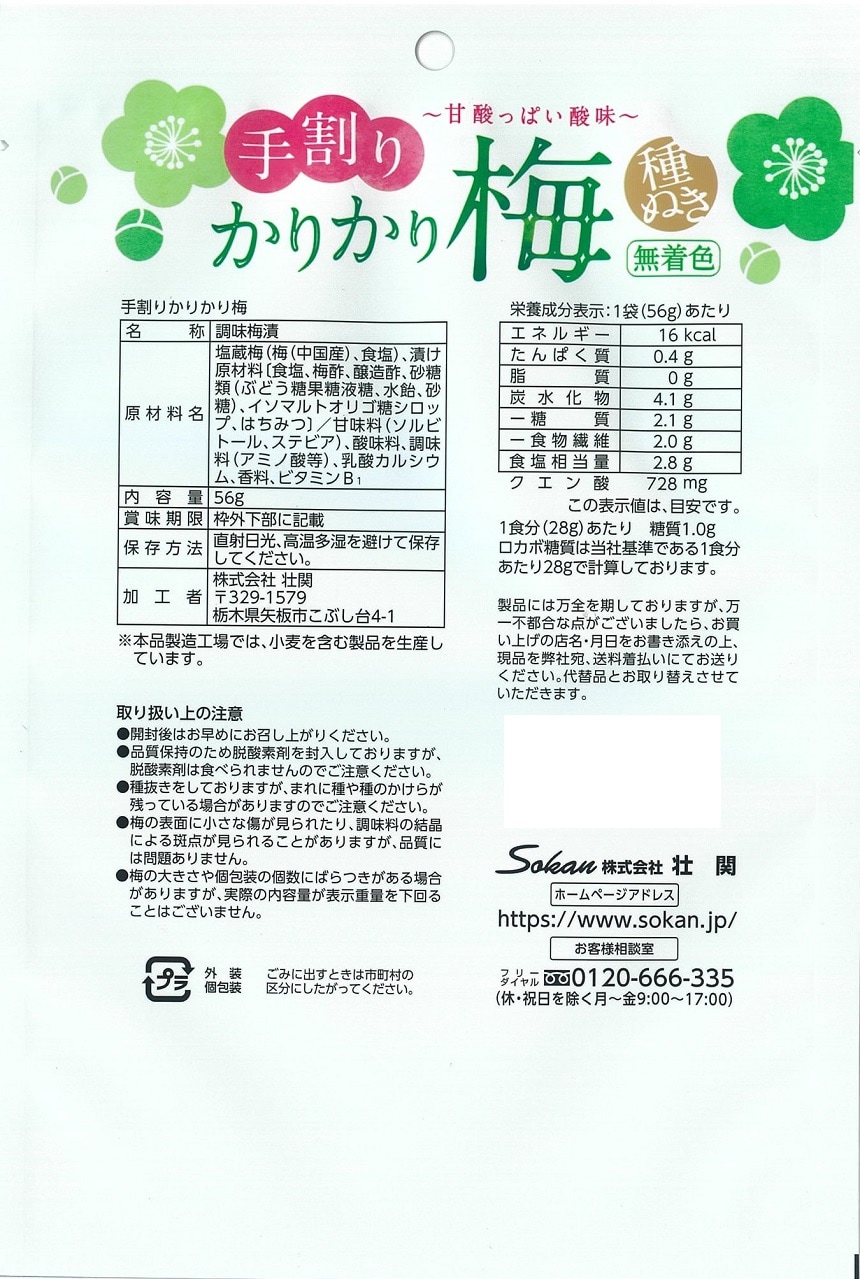 [18個]壮関 無着色手割りカリカリ梅 個包装タイプ 56g