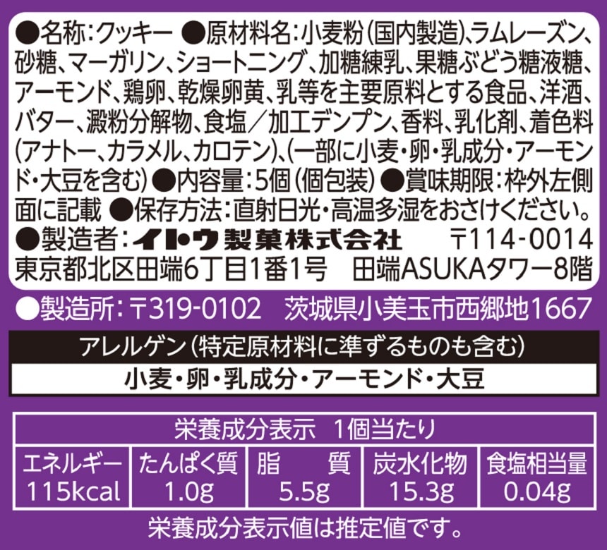 [36箱]イトウ製菓 コンフェッティ カリフォルニア 5個入 | こだわりのラム酒に漬けたラムレーズンがたっぷりと入ったクリームを発酵バター入りのサブレ生地でサンドしました。