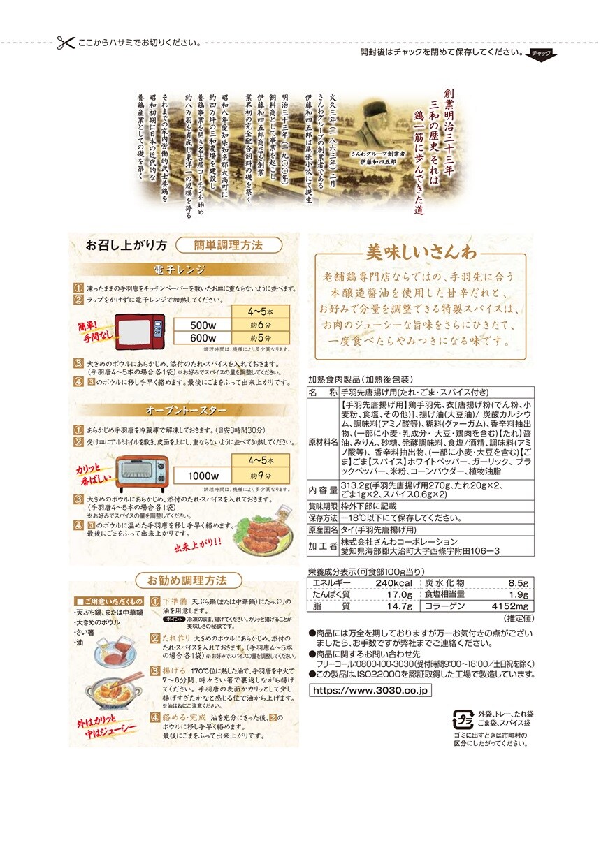 ・老舗鶏専門店 手羽唐 313.2g(手羽先唐揚げ用270g、たれ20g×2個、ごま1g×2個、スパイス0.6g×2個)×1袋