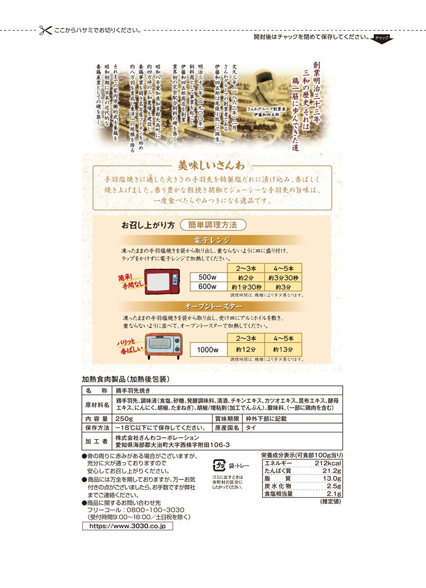 骨付きの手羽をさんわ特製スパイスで味付けし、しっとりジューシーに仕上げた骨付きチキンバーです。鶏専門店「鶏三和」で人気の惣菜の味をご家庭で簡単にお楽しみいただけます。