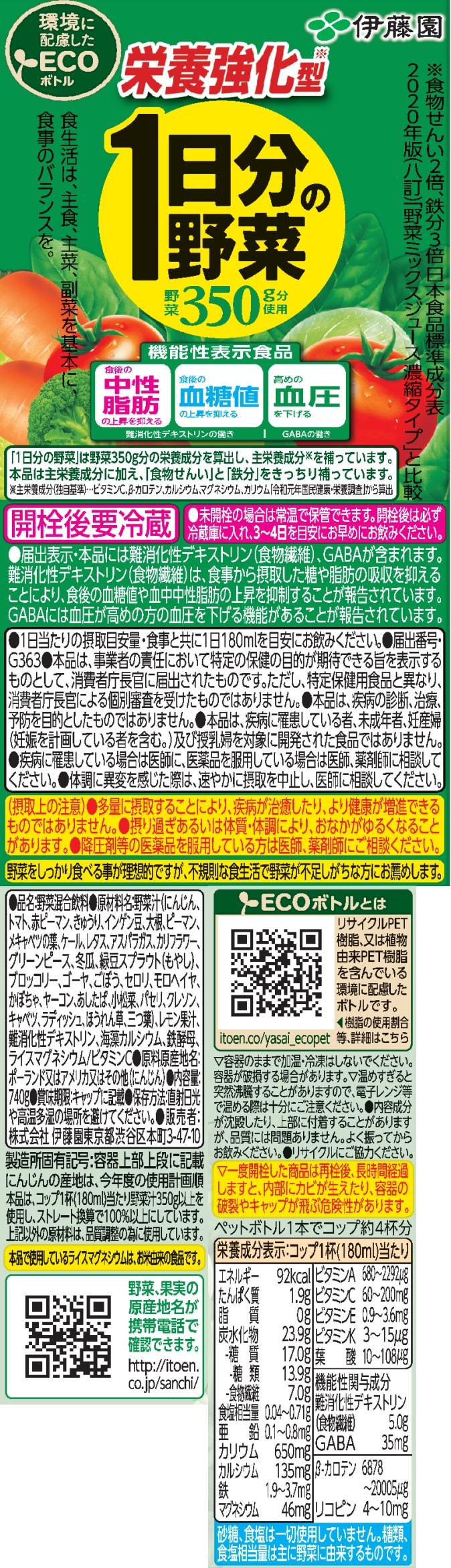 [15本]【機能性表示食品】伊藤園 栄養強化型 1日分の野菜 PET 740g | 食後の中性脂肪・血糖値の上昇を抑え、高めの血圧を下げる機能性を有した「1日分の野菜 」です。