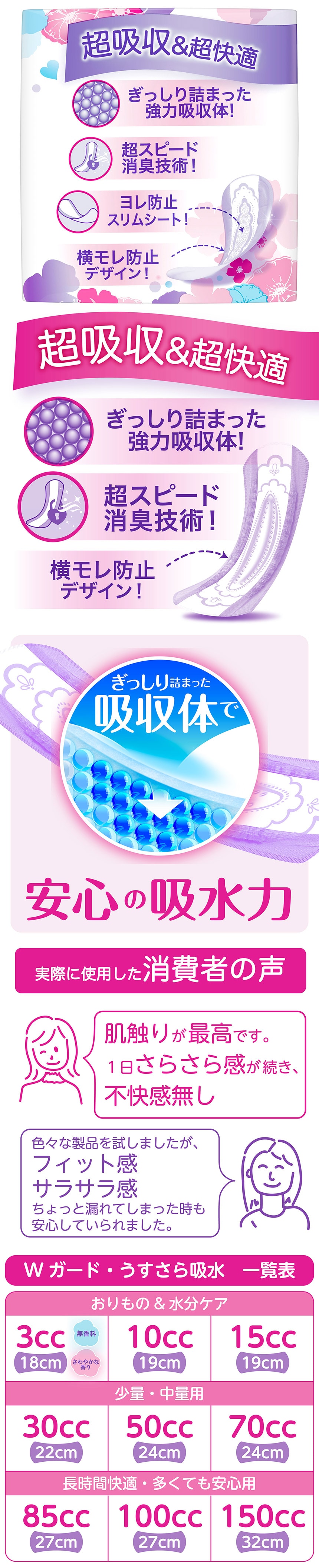 ぎっしり詰まった強力吸収体!2層吸収シート!超スピード消臭技術!横モレ防止デザイン!