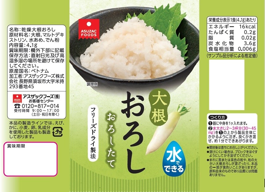 [120食]アスザックフーズ 水でできる大根おろし 4.1g | する手間いらず!水で簡単、フリーズドライの大根おろしの素。