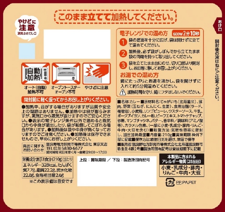 [30食]富良野地方卸売市場 厚切り豚バラのポークカレー 210g | 北海道産のじゃがいもが丸ごと1個入ったポークカレー
