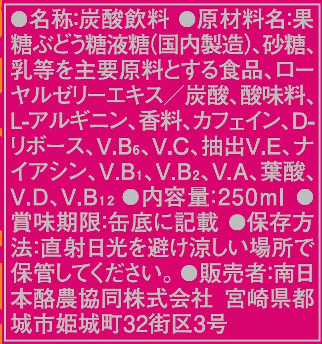 エネルギー 56kcal、たんぱく質 0.3g、脂質 0g、炭水化物 13.7g、食塩相当量 0.01g、ビタミンB6 3.2mg、カフェイン 40mg、アルギニン 120mg、D-リボース 35mg