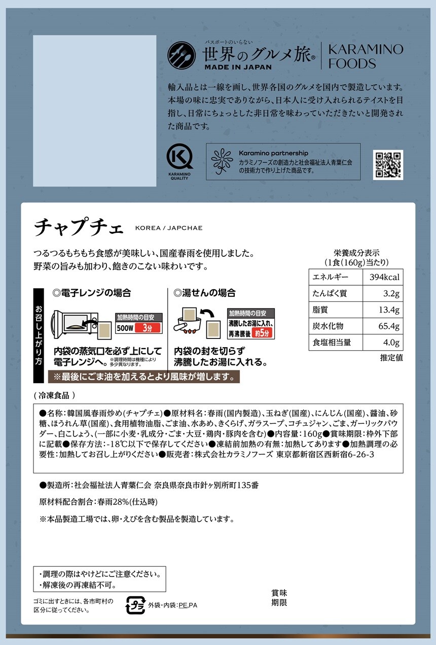 国産さつまいもでん粉と馬鈴薯でん粉を原料とする春雨で造った、韓国風春雨炒めチャプチェ。