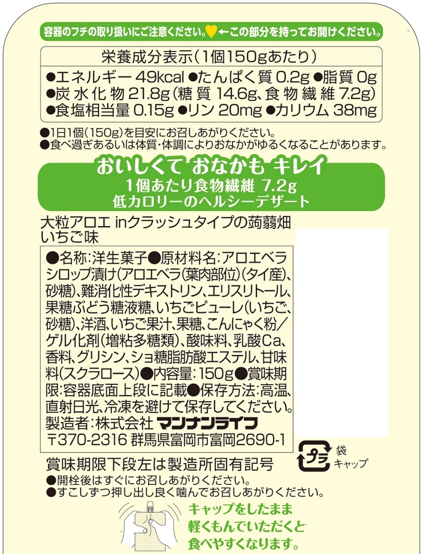 【初回限定】[6個]マンナンライフ 大粒アロエinクラッシュタイプの蒟蒻畑いちご味 150g | おいしくて おなかも キレイ