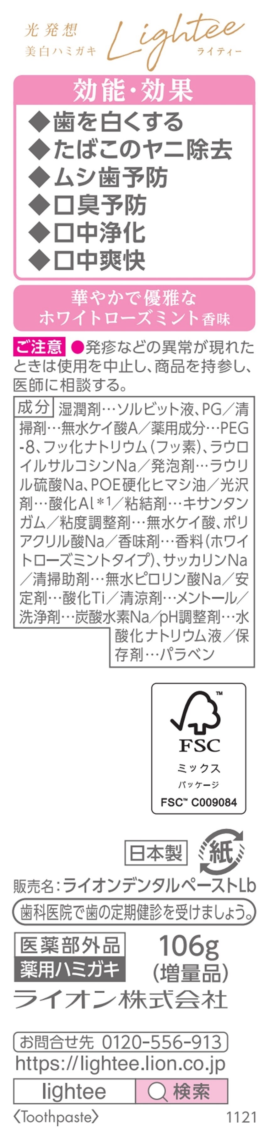 - 【医薬部外品】Lighteeハミガキ ホワイトローズミント 増量品 106g