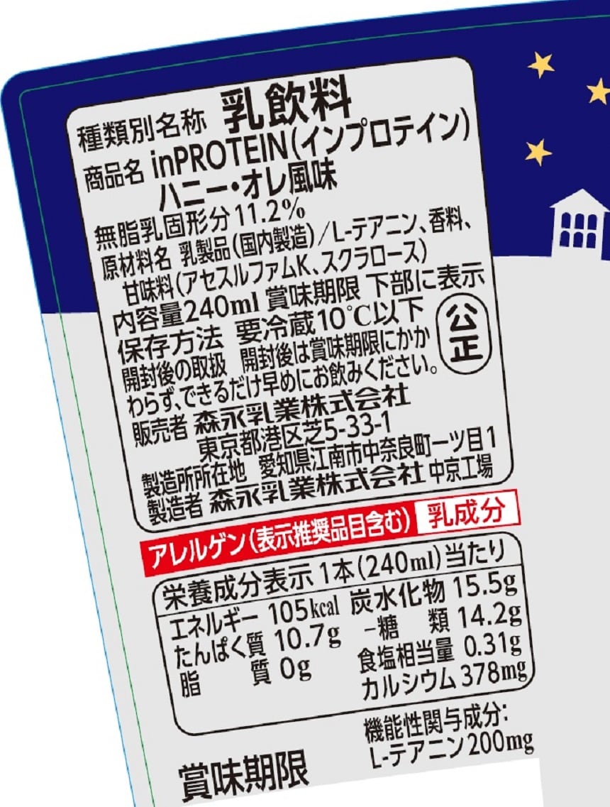 [40本]【機能性表示食品】森永乳業 inPROTEIN ハニー・オレ風味 240ml | 睡眠の質を改善(起床時の疲労感を軽減)する機能が報告されているL-テアニンを200mg配合