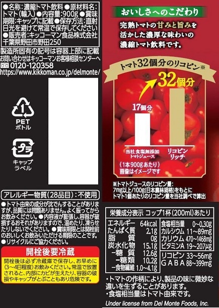 完熟トマトをたっぷり使用し、1本900gにトマト32個分のリコピンを含有した濃厚なトマト飲料。