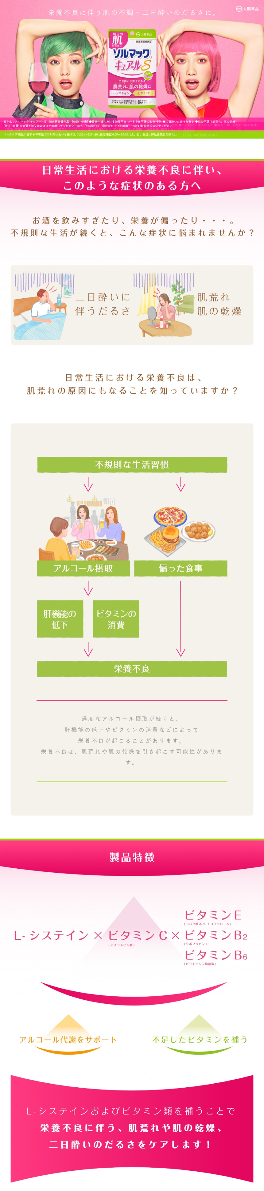 L-システインおよびビタミン類を補うことで栄養不良に伴う肌荒れや肌の乾燥、二日酔いのだるさをケアします!