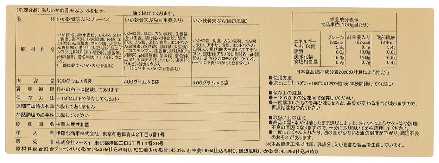 紅ショウガ入り、磯辺風味、プレーンのいか軟骨天ぷらをそれぞれ400gにパッキング。