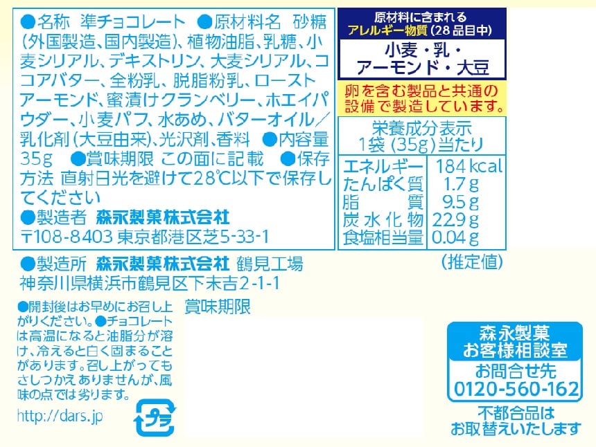 厳選したナチュラル素材(大麦シリアル・小麦シリアル・小麦パフ・アーモンド・ドライクランベリー)をふんだんに使用した満足感を得られるチョコレート。