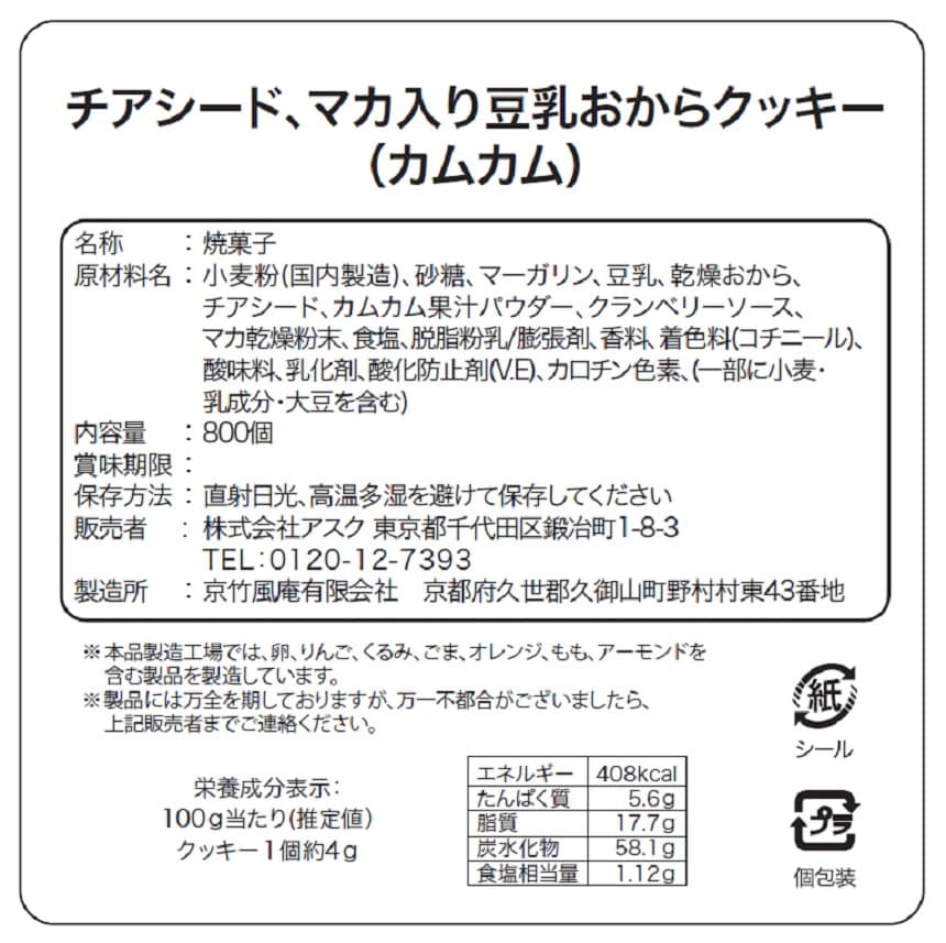 [800枚]アスク チアシード、マカ入り豆乳おからクッキー カムカム 約4g | 水分で膨らむチアシードとおからでダブルの満腹感!個包装で持ち運びも便利!