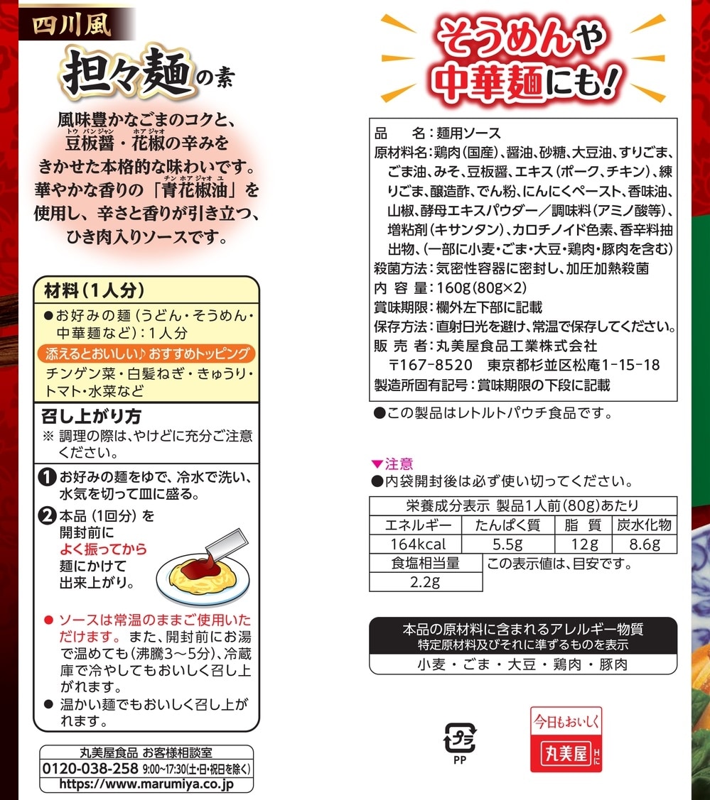 ・温めいらずでお好みの麺にかけるだけで、手軽に四川風担々麺が楽しめます。