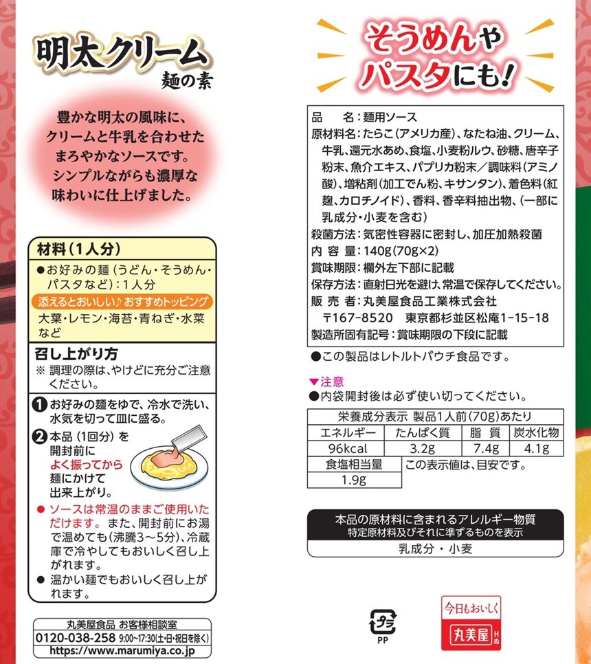 ・温めいらずでお好みの麺にかけるだけで、手軽に明太クリーム麺が楽しめます。