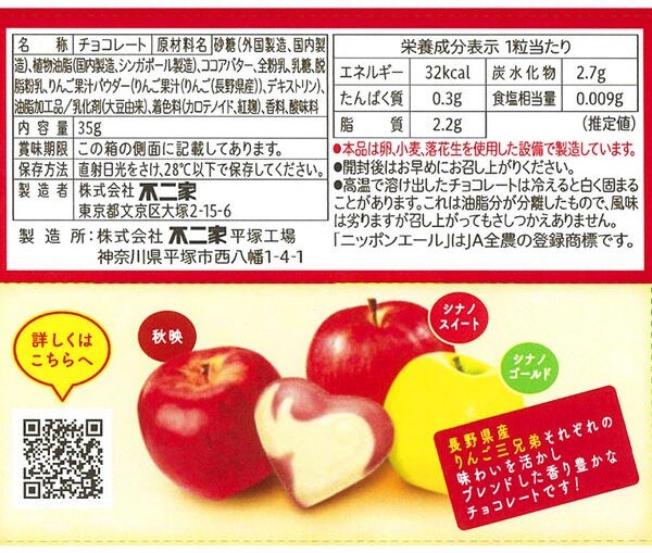 不二家のロングセラー「ハートチョコレート」ブランドより、長野県産の「りんご三兄弟」を使用した新商品が期間限定で登場。