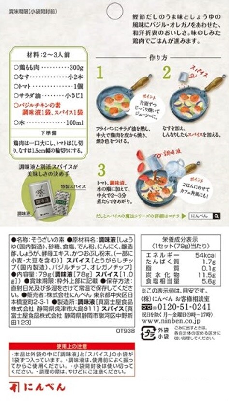 [20個]にんべん だしとスパイスの魔法 しみじゅわバジルチキン 79g | 「しみじゅわバジルチキン」は、鶏肉、なす、トマトを用意するだけ!
