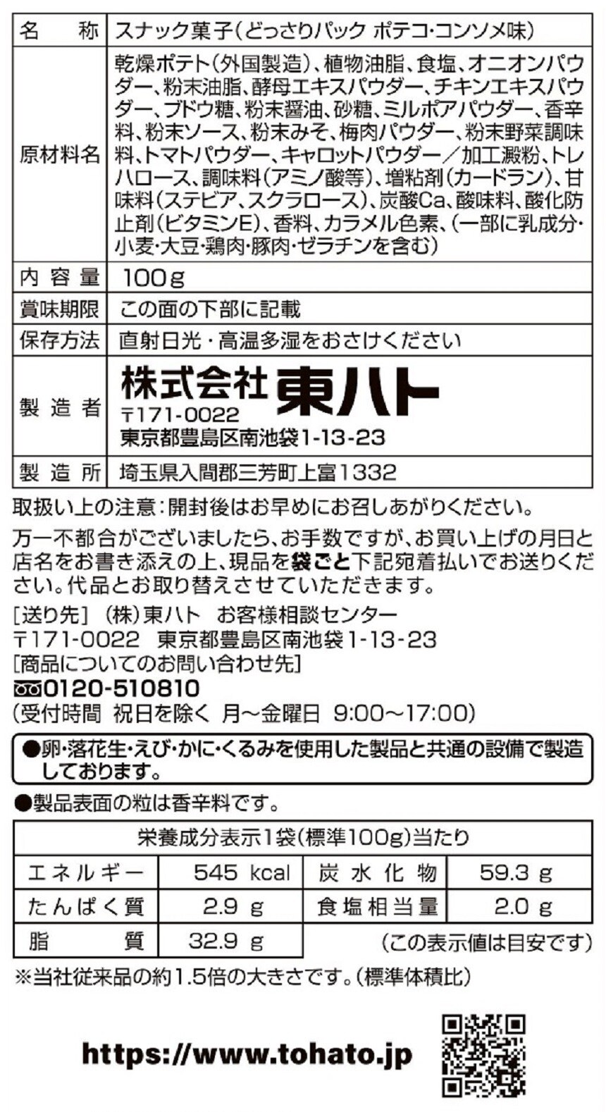 [20袋]東ハト どっさりパック ポテコ コンソメ味 100g | どっさりでっかい大容量パックのポテココンソメ味です。