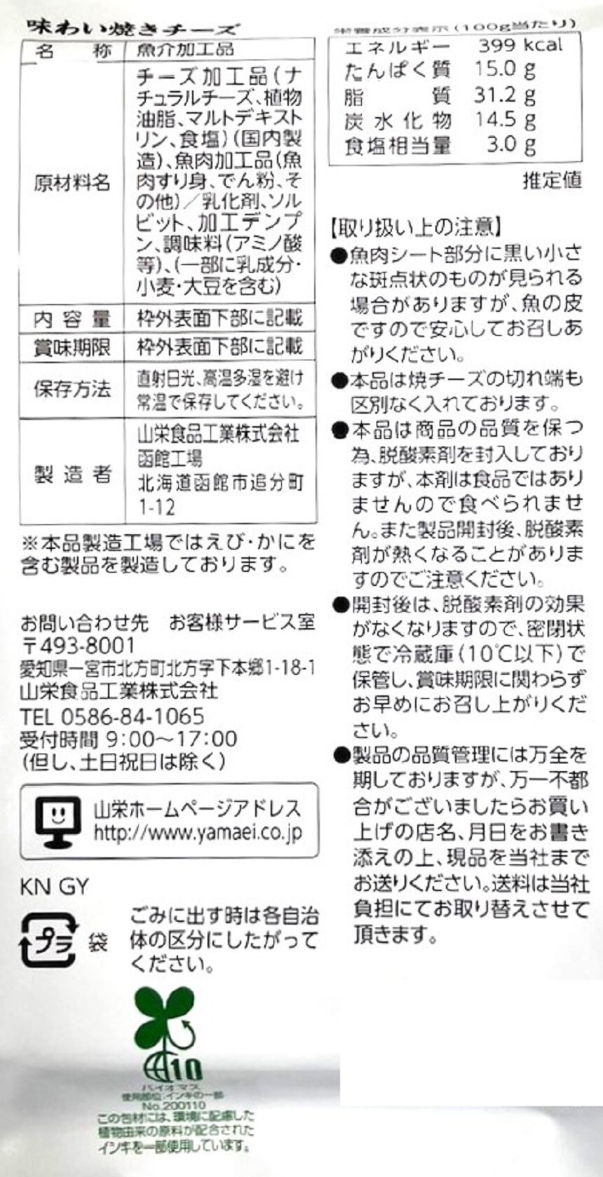 北海道産チェダーチーズとカマンベールチーズ、クリームチーズの3種をブレンドした味わい豊かなチーズを魚肉シートと合わせ、こんがりと焼き上げました。