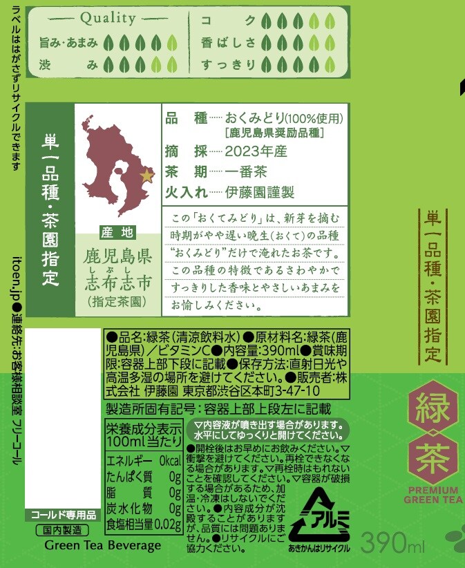 2023年産の鹿児島県志布志市産でバランスの良い品種「おくみどり」の一番茶を100%使用し、お茶の個性を愉しんでいただく緑茶飲料。