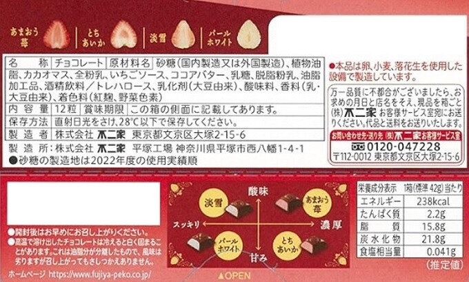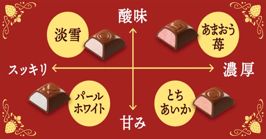 福岡県産あまおう苺、栃木県産とちあいか、奈良県産淡雪、奈良県産パールホワイトの4種の苺を食べ比べできるアソートチョコレートです。
