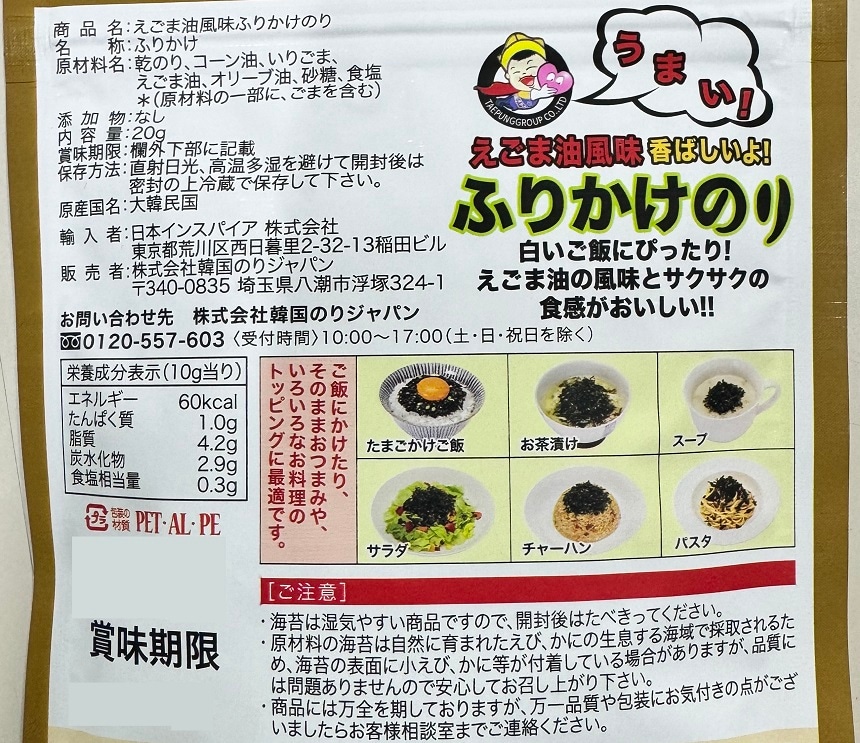[60袋]韓国のりジャパン えごま油風味ふりかけのり 20g | 上品な味